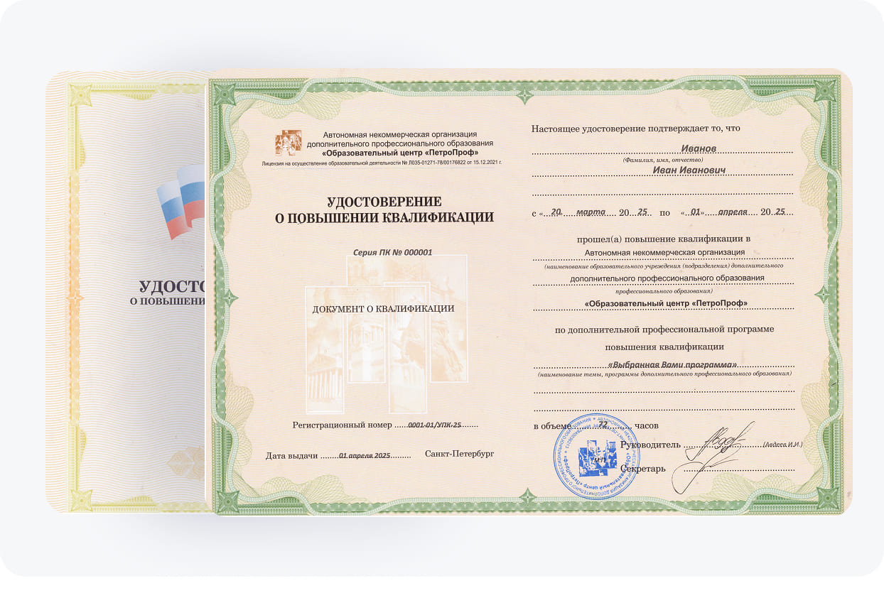 Наши программы повышения квалификации построены наиболее удобным для слушателя образом. Они отличаются структурированным материалом, большим перечнем полезных тем, а также полностью соответствуют установленным государственным стандартам и требованиям. По окончанию обучения студенты получаются удостоверение о повышении квалификации. Этот документ станет главным подтверждением приобретенных компетенций, навыков и умений специалиста.